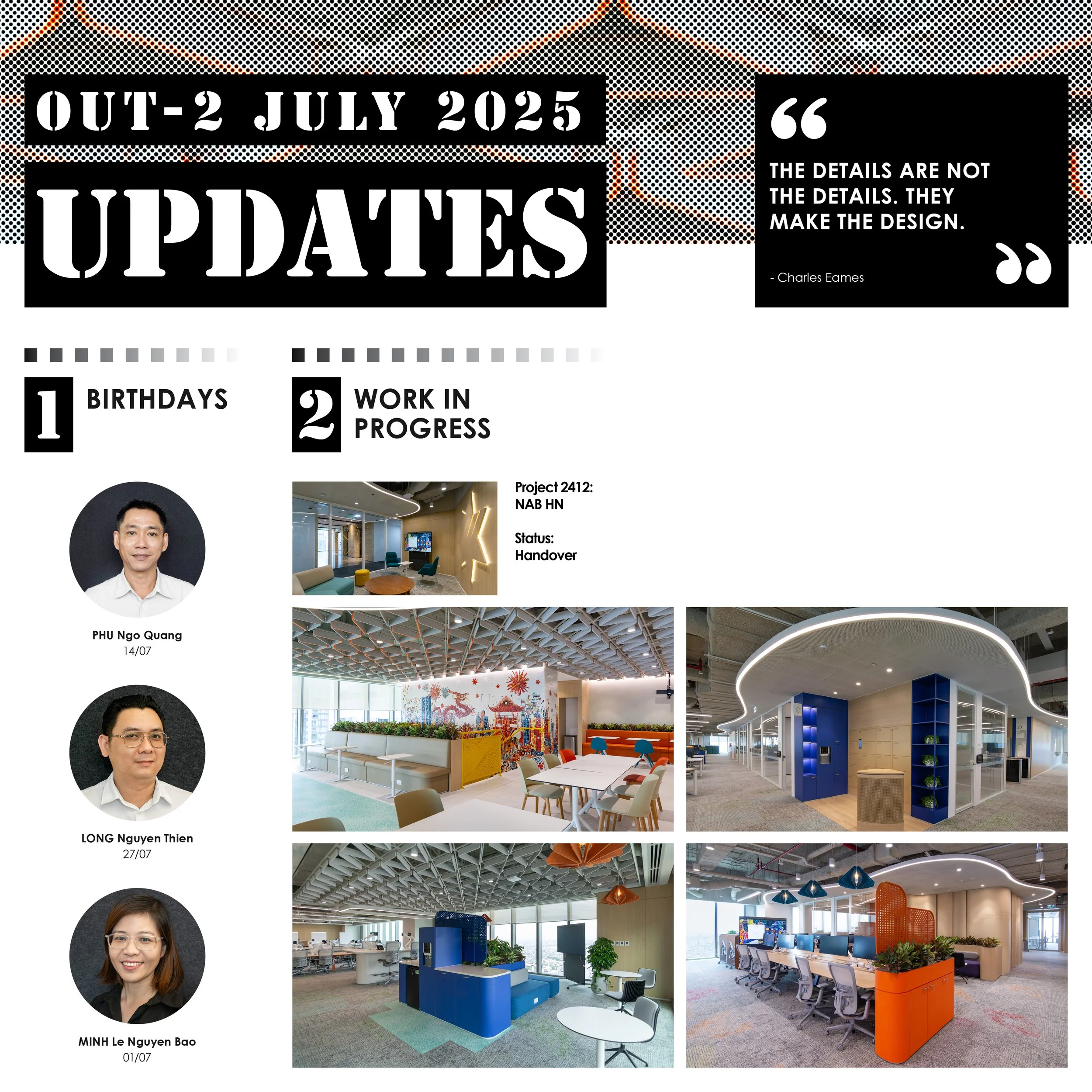 Tháng 7 tiếp tục ghi dấu một chặng đường phát triển đầy thành tựu của đội ngũ OUT-2 Design. Từ tiến độ dự án cho đến sự hợp tác chặt chẽ với khách hàng và đối tác, công việc trong tháng này thể hiện cam kết bền vững của chúng tôi đối với sự xuất sắc trong thiết kế và chất lượng bàn giao dự án.