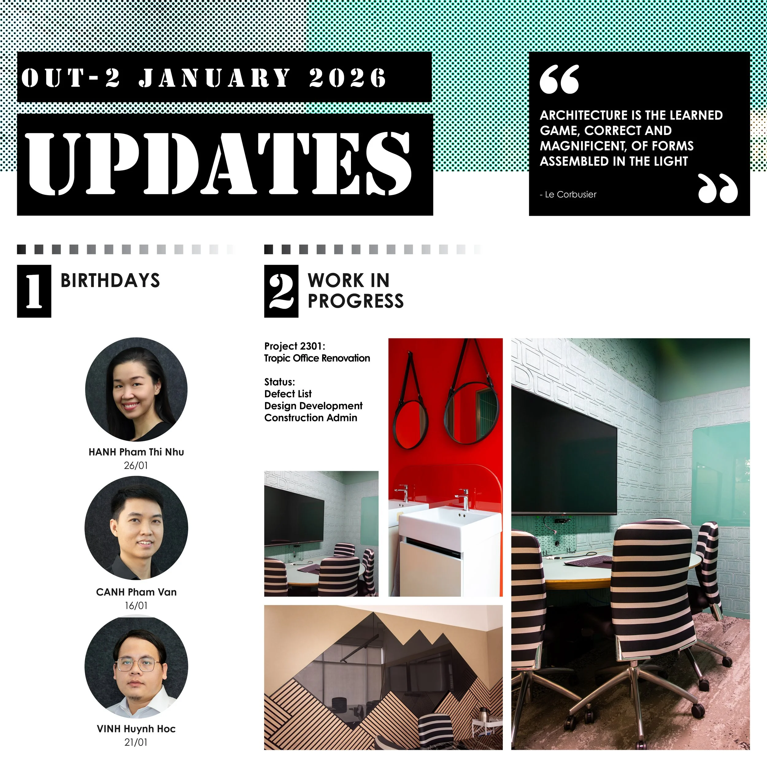 Tháng một đánh dấu sự tái khởi động toàn bộ các hoạt động dự án của OUT-2 Design Group, có nhiều thiết kế được thúc đẩy qua giai đoạn thiết kế ý tưởng. Ở giai đoạn này, định hướng chiến lược được chuyển hóa thành các khung không gian, thiết lập những định hướng rõ ràng nhằm liên kết mục tiêu tổ chức với các kết quả hiệu quả dài hạn.